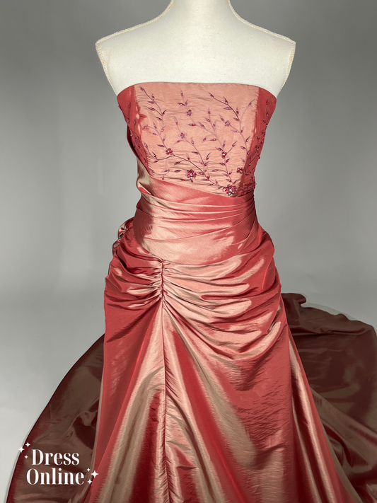 Zalmroze Strapless Vintage Avondjurk met Bloemenborduursels Maat L - 271