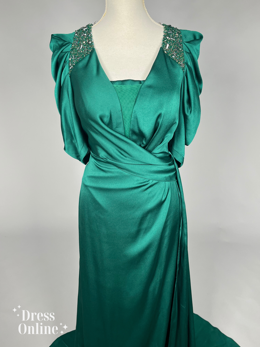 Groene Galajurk met Elegante Plooien en Versierde Schouders Maat M - 225