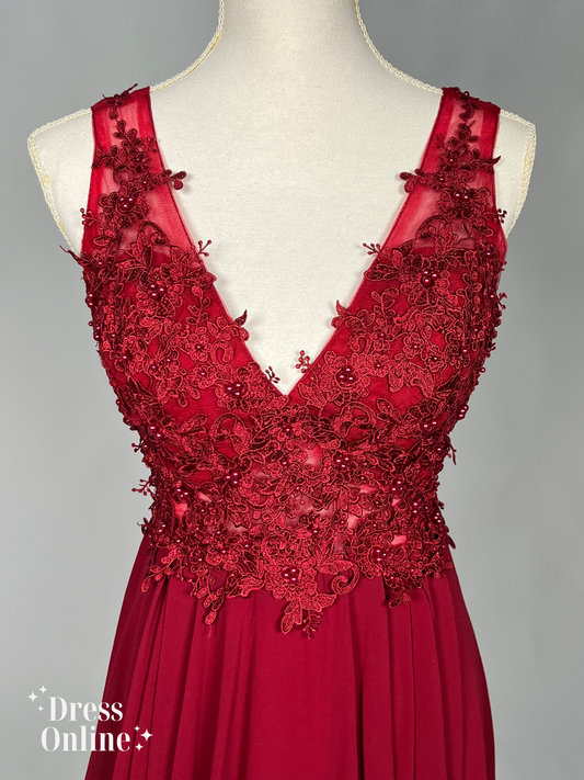 Verleidelijke Donkerrode Cocktailjurk met kant en Parels maat M - 196