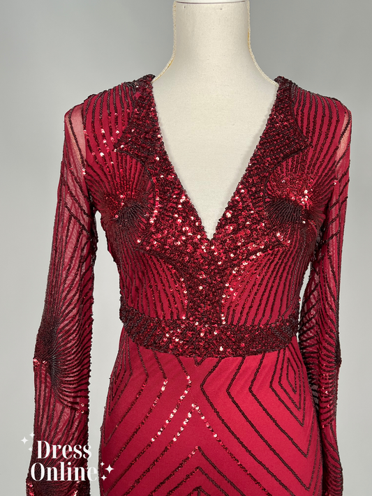 Elegante Donkerrode Avondjurk met Gedetailleerde Pailletten en Lange Mouwen - Maat S - 380