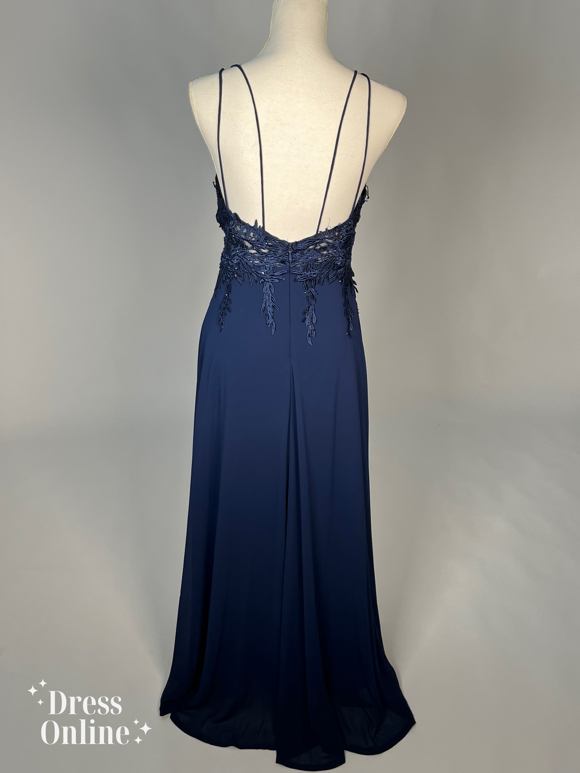 Stap in een wereld van tijdloze elegantie met deze betoverende donkerblauwe galajurk. De jurk heeft aan beide kanten twee dunne bandjes die een prachtig detail vormen op de rug en een vleugje verfijning toevoegen.