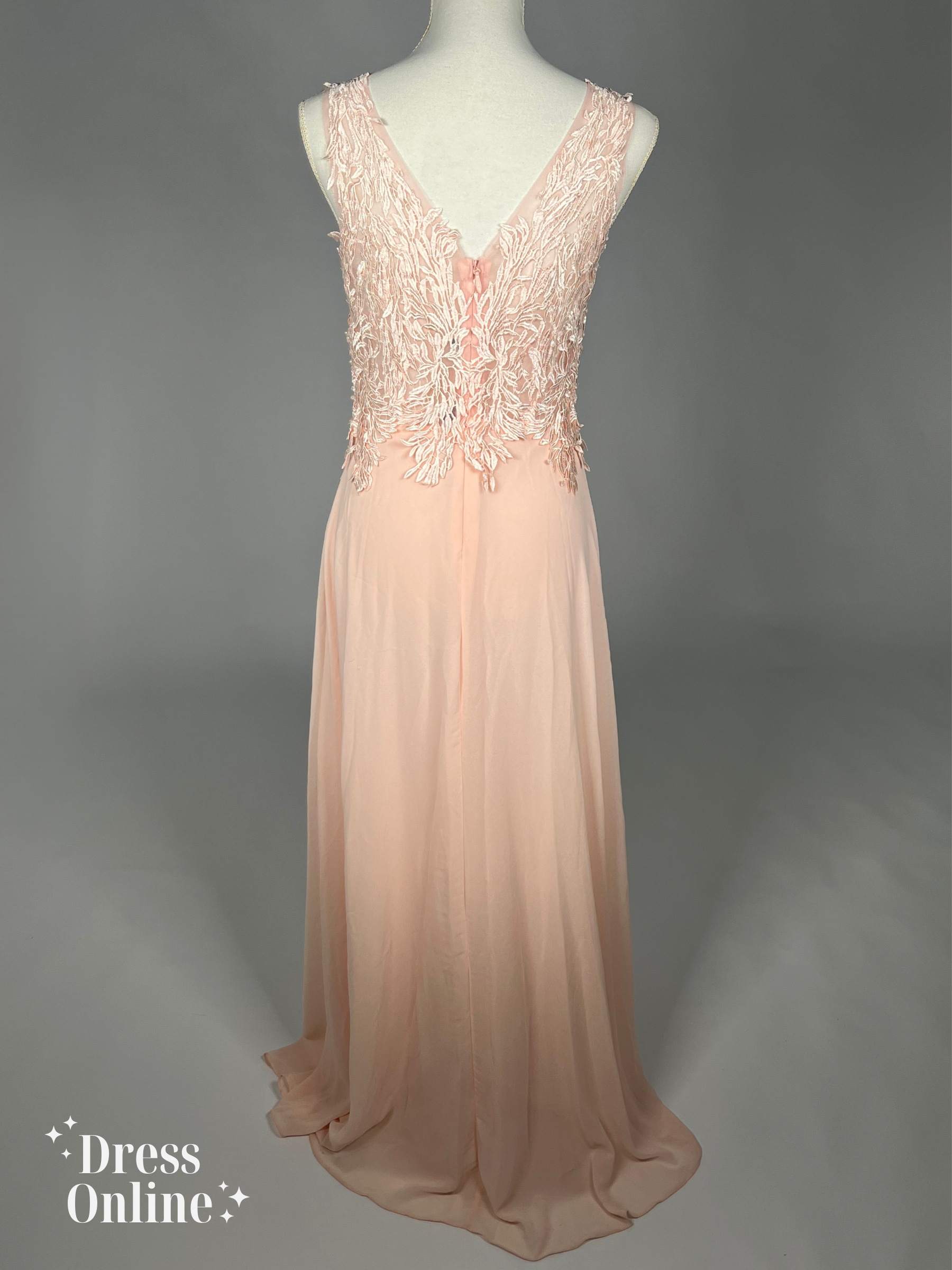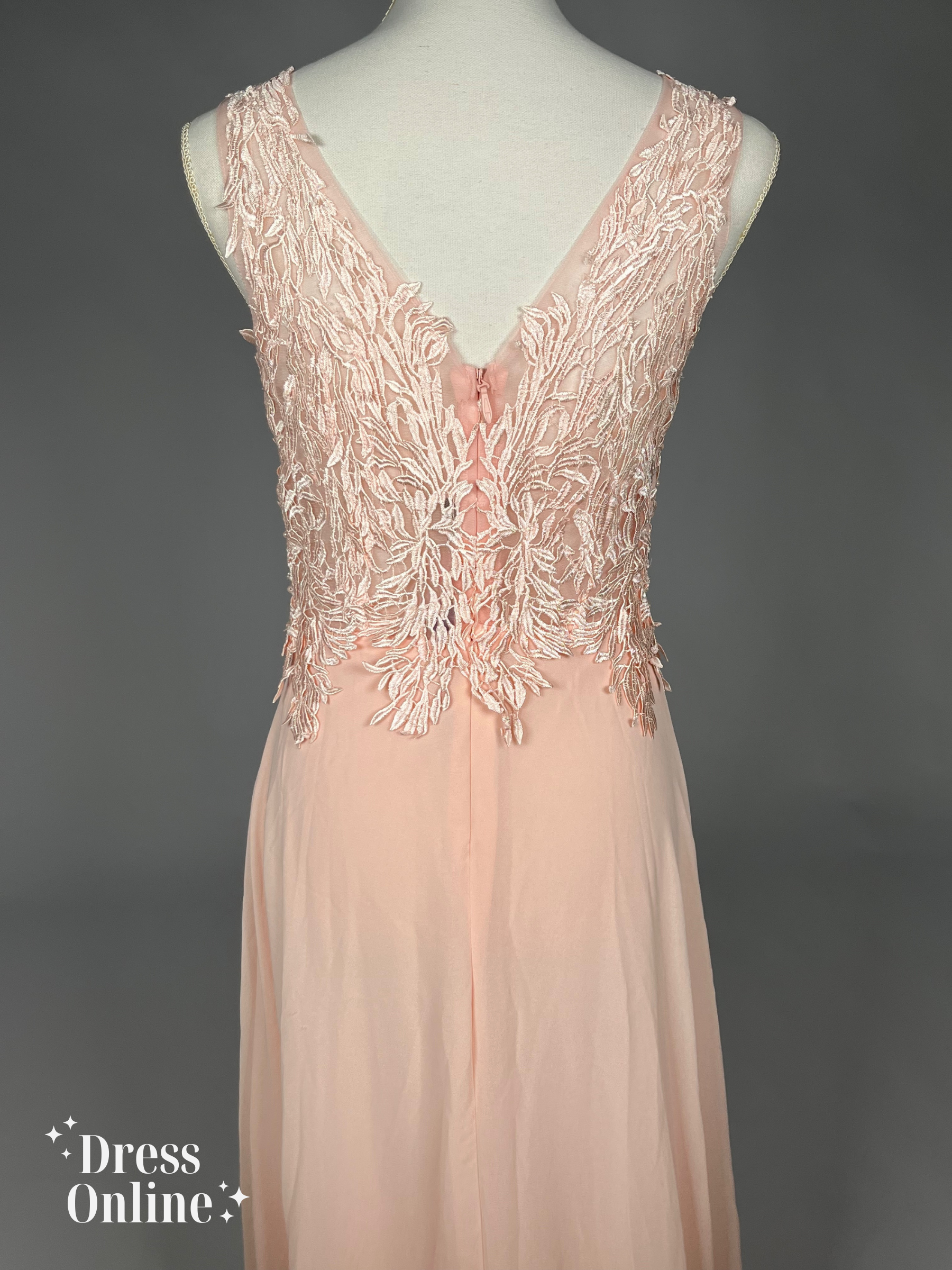 Maak een betoverende indruk met onze pastel oranje galajurk, speciaal ontworpen om je te laten stralen op elke formele gelegenheid. Deze jurk, beschikbaar in maat M, combineert verfijnde details met tijdloze elegantie.