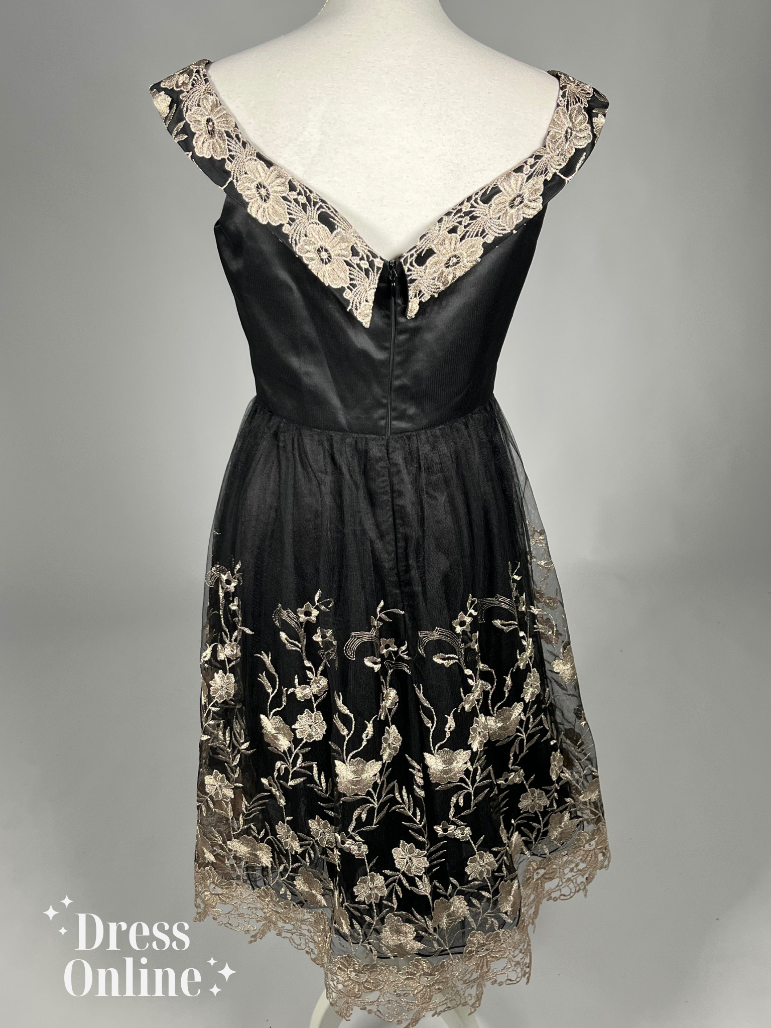 Elegante Zwart-gouden Cocktailjurk met Geborduurde Bloemen - Maat M - 360