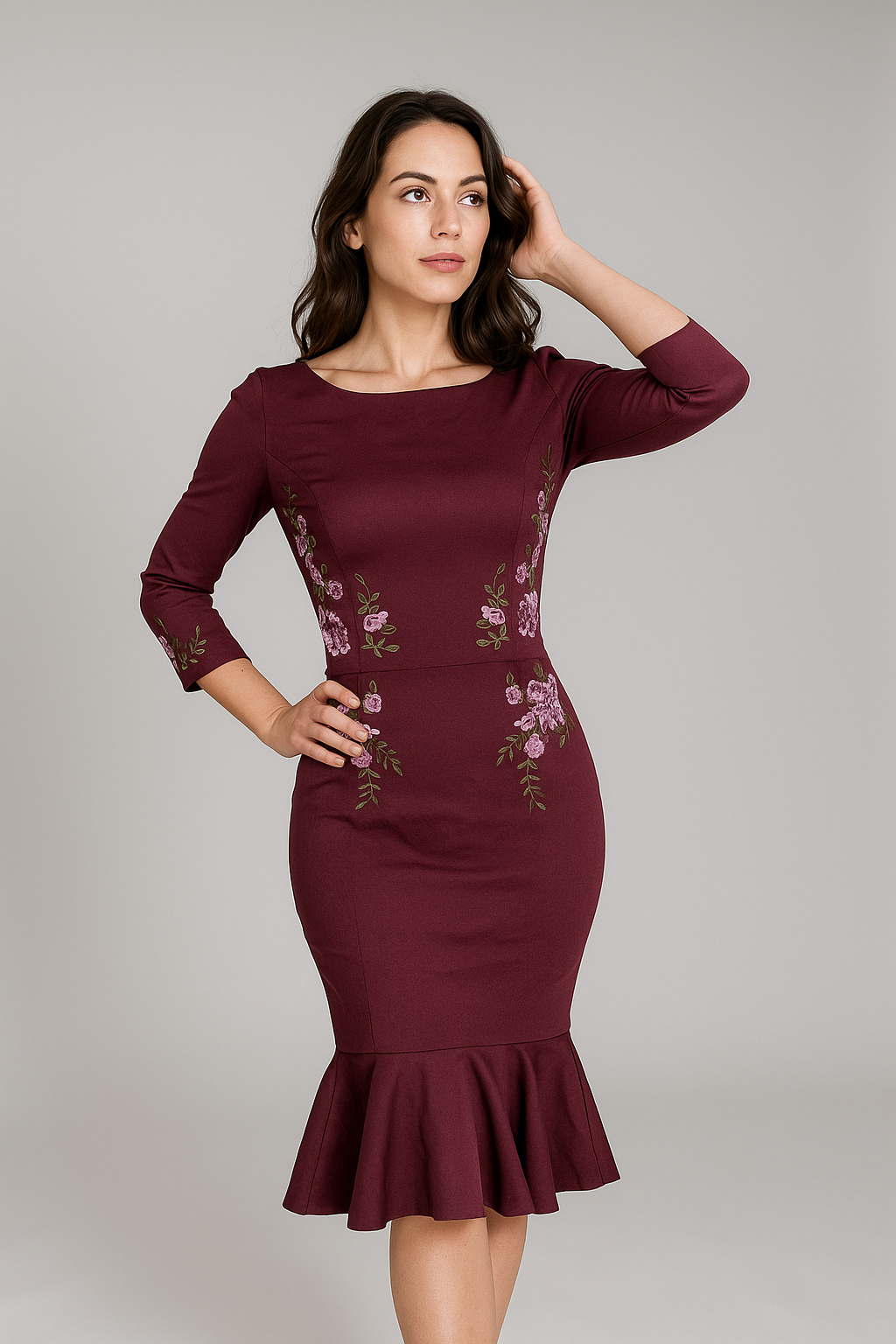 Deze stijlvolle donkerpaarse jurk is een ware blikvanger voor elke gelegenheid. Uitgevoerd in een soepele stof die elegant valt, benadrukt deze jurk je figuur met zijn slim-fit taille en subtiele peplumzoom. De jurk is verfraaid met verfijnd geborduurde bloemen in roze en groen die langs de mouwen en de zijkanten een charmant accent toevoegen. Met een klassieke boothals en driekwart mouwen biedt dit ontwerp een comfortabele pasvorm, terwijl de open rug zorgt voor een verrassend detail. Ideaal voor zowel formele gelegenheden als chique avondjes uit.