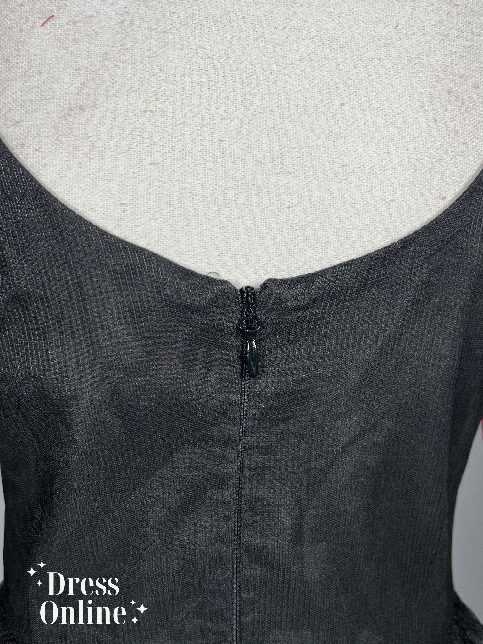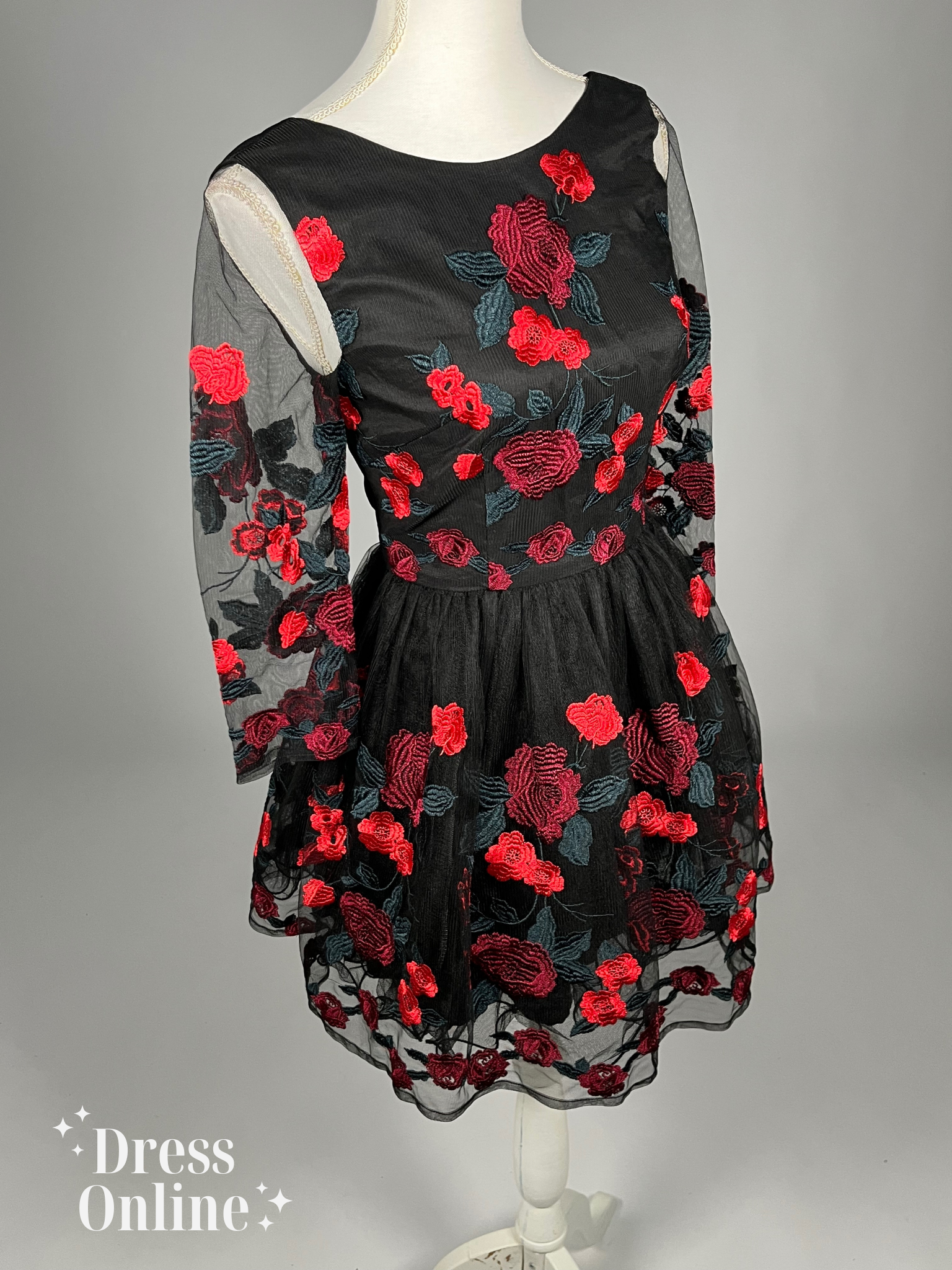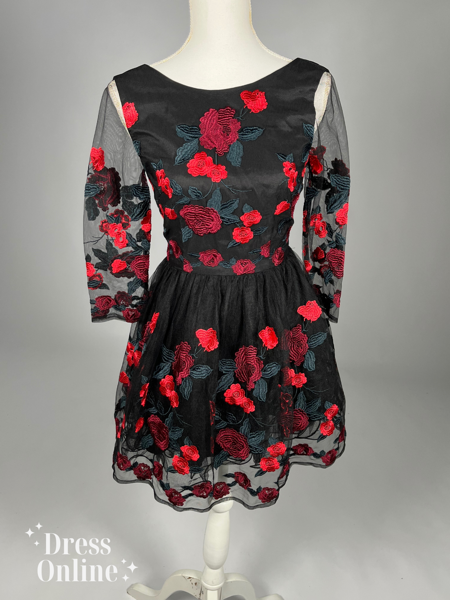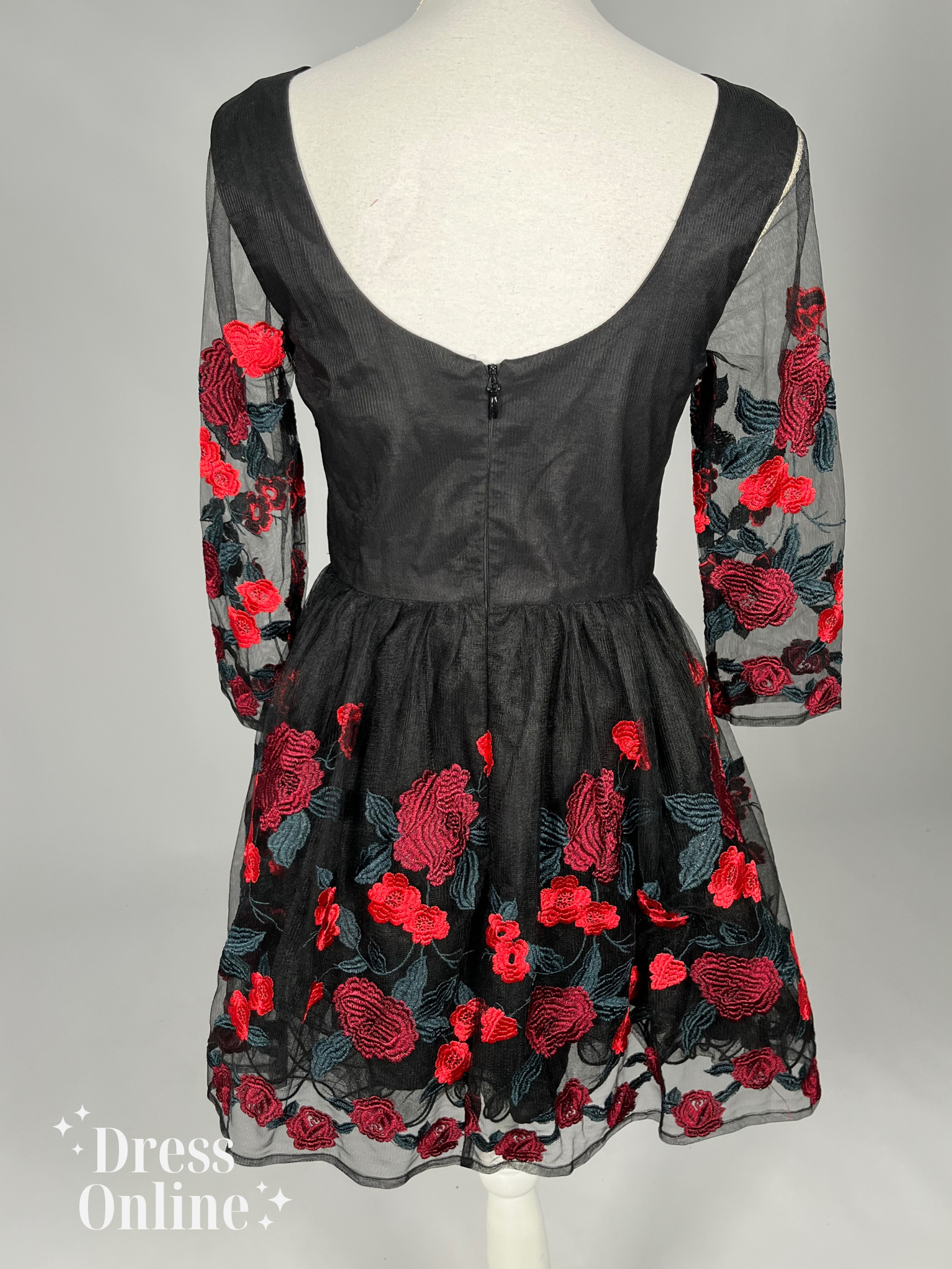 Stijlvolle Zwarte Jurk met Rode Geborduurde Rozen - Maat S - 416