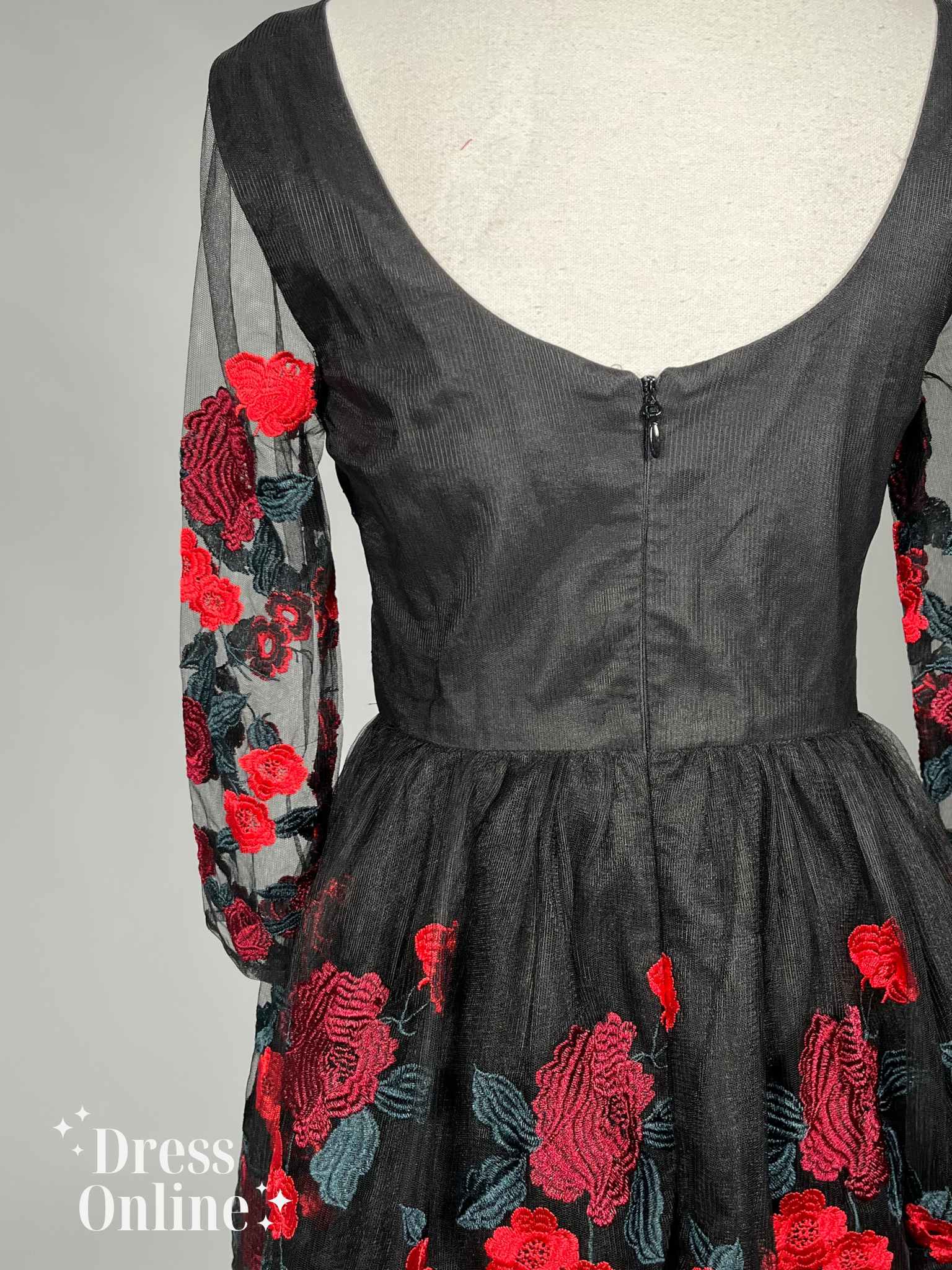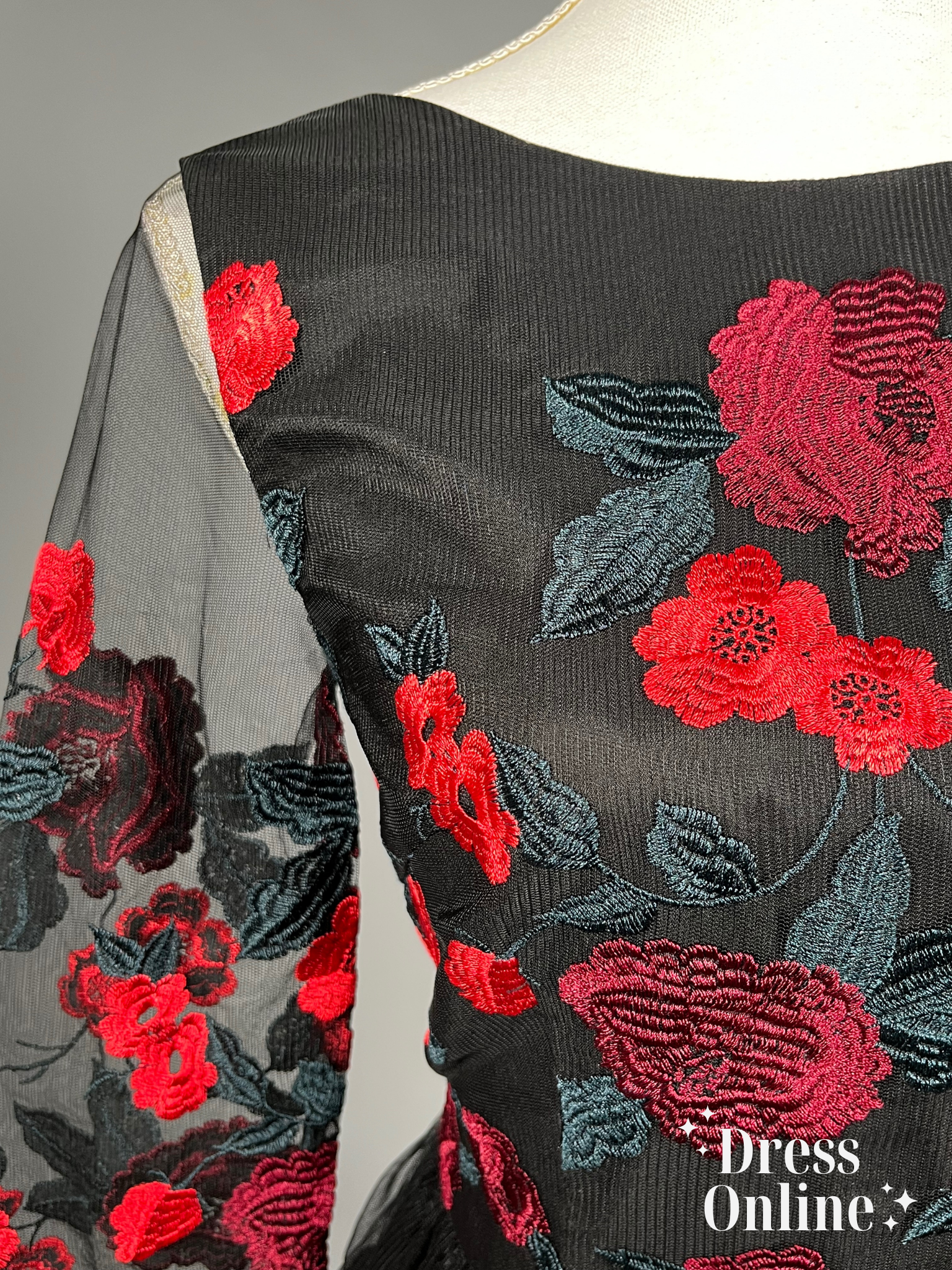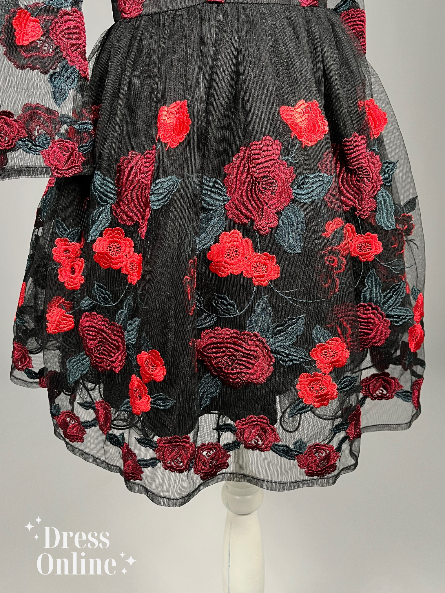 Deze verfijnde zwarte jurk valt op door de prachtige rode geborduurde rozen die het geheel een romantische en chique uitstraling geven. De jurk heeft een hoge halslijn die elegantie toevoegt aan het design, terwijl de driekwart mouwen en het luchtige rokgedeelte zorgen voor een sierlijke beweging. Deze jurk is vervaardigd uit hoogwaardige materialen, wat zorgt voor een comfortabele pasvorm en langdurige kwaliteit. Ideaal voor speciale gelegenheden waarbij een stijlvolle en klassieke look gewenst is. Perfect voor avondfeesten of formele bijeenkomsten.